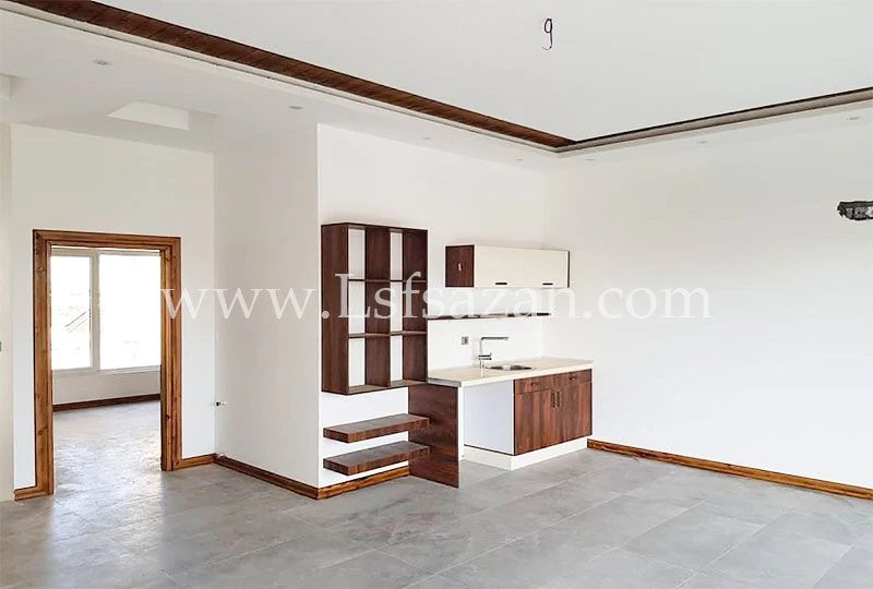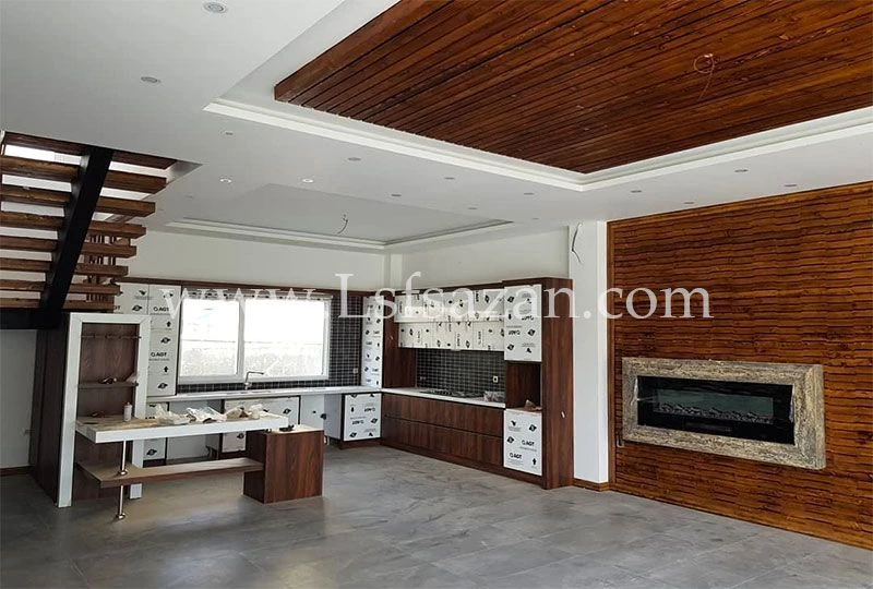 تجهیزات داخلی : اجرای کناف سبز ایران (ضدآب) و چوب لمبه ترکیبی ، کابینت بندی هایگلاس ترکیه ای